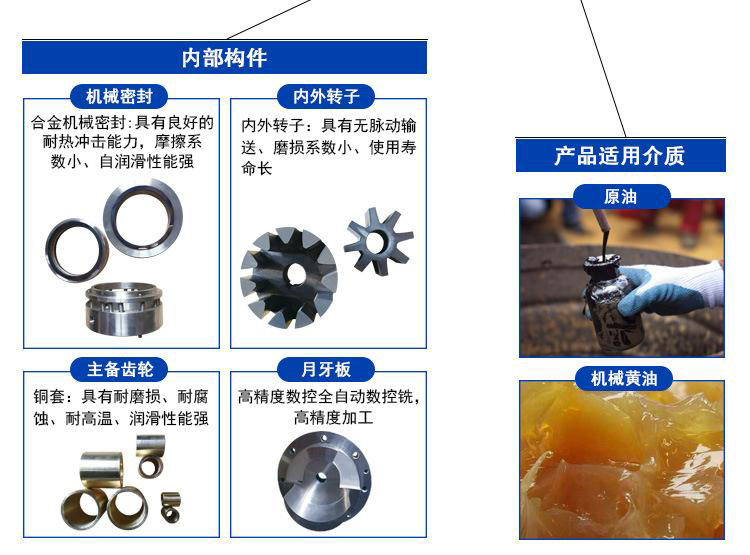 高粘度液體泵主要有內外轉子、軸、泵體、泵蓋、托架、密封、軸承等組成。