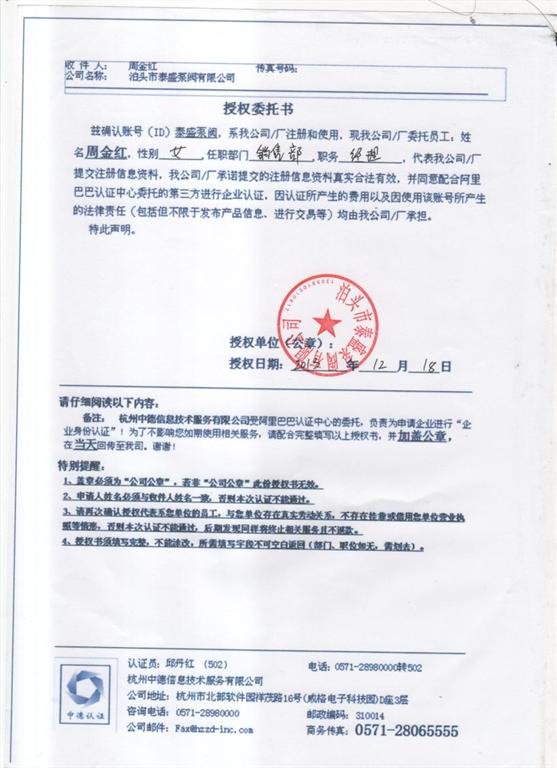 泰盛泵閥公司為了更進(jìn)一步打造出自己的“齒輪泵行業(yè)_泰盛”品牌。在2014年12月19日通過了阿里巴巴第三方的企業(yè)身份認(rèn)證,認(rèn)證中心對(duì)我公司提交的的所有泰盛泵閥資料信息合法有效。這是泰盛公司加蓋公章并簽字的認(rèn)證書合同。